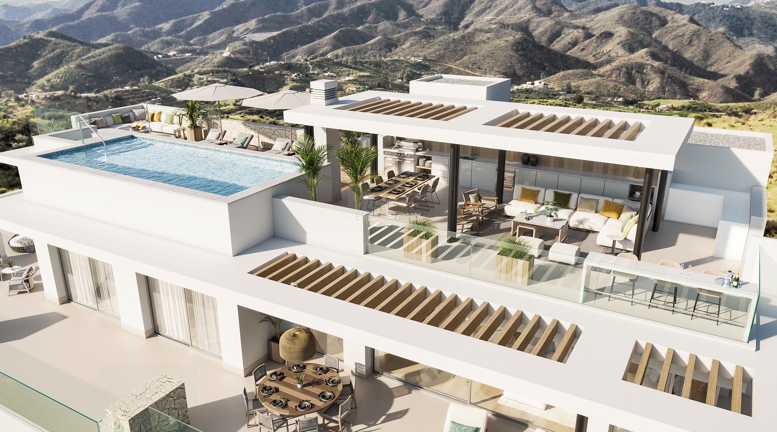 Новые, меблированные апартаменты в Охене, Андалусия, Коста-дель-Соль. В апартаментах площадью 134 кв.м есть 3 cпальни, 2 санузла, гостиная и кухня. Из окон открывается прелестный вид на море. На территории есть сад.