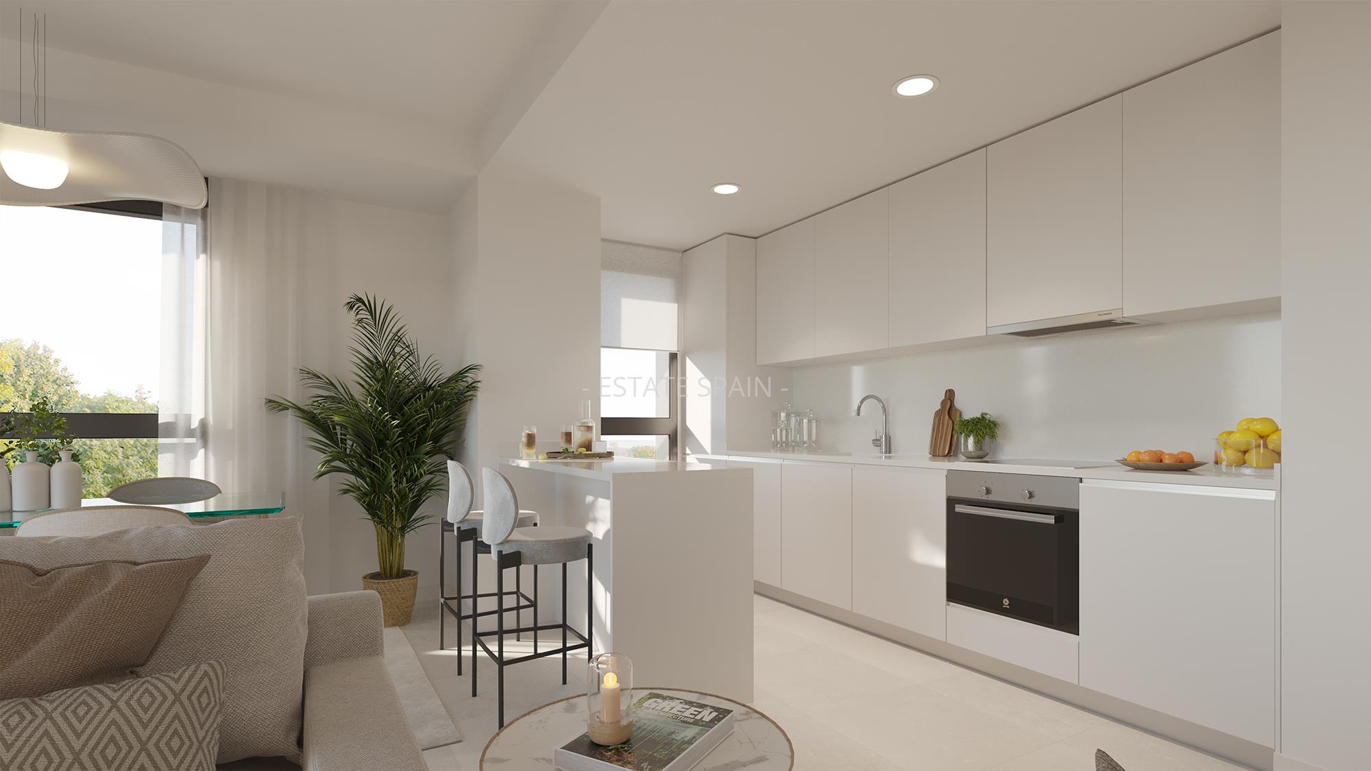 Новые, меблированные апартаменты в Малаге, Андалусия, Коста-дель-Соль. В апартаментах площадью 99 кв.м есть 2 cпальни, 2 санузла, гостиная и кухня. На территории есть сад.