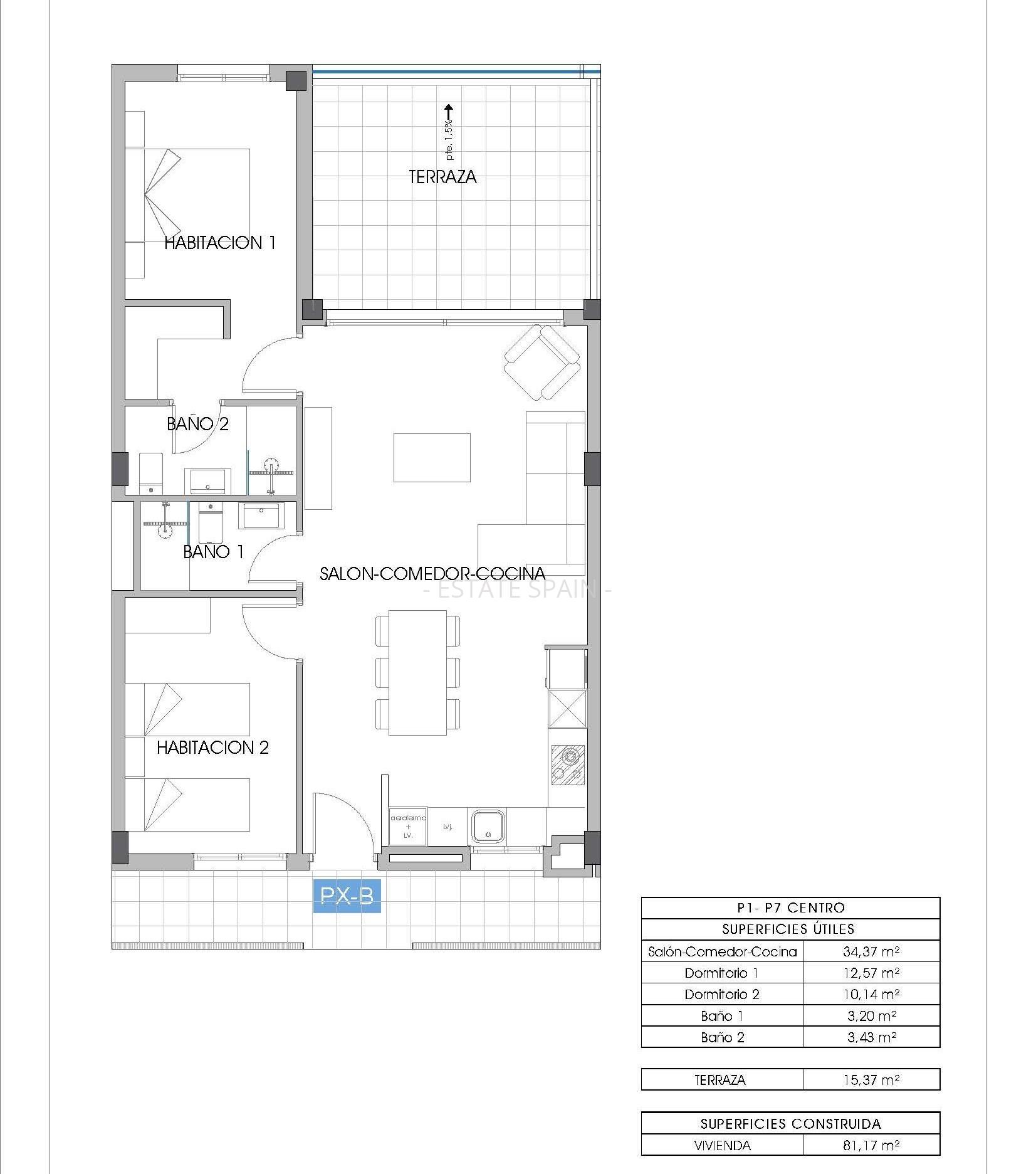 Новые апартаменты недалеко от моря в Вильяхойосе, Коста Бланка. В апартаментах площадью 81 кв.м есть 2 cпальни, 2 санузла, гостиная и кухня.