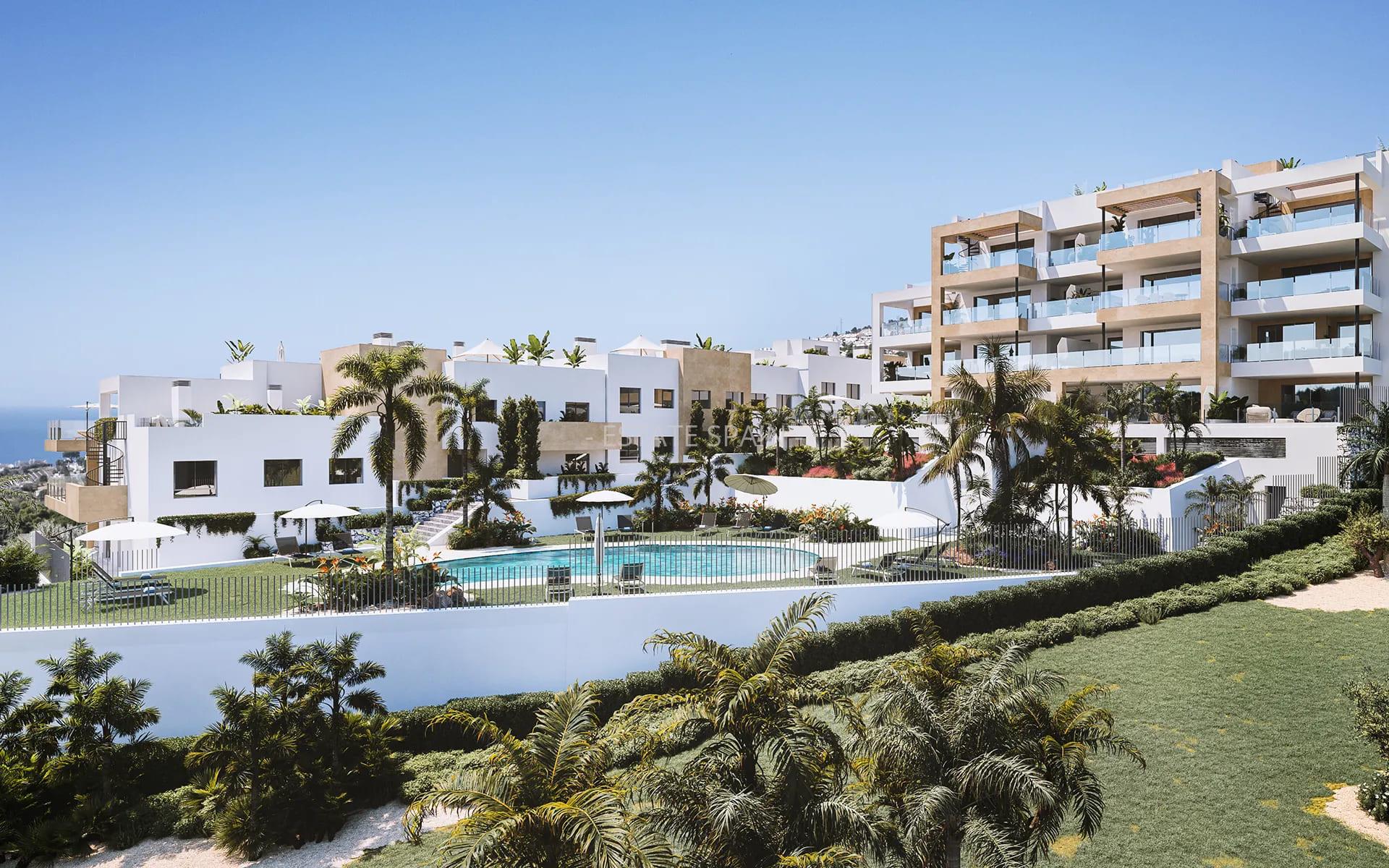 Новые, меблированные апартаменты в Бенальмадене, Андалусия, Коста-дель-Соль. В апартаментах площадью 102 кв.м есть 2 cпальни, 2 санузла, гостиная и кухня. Из окон открывается роскошный вид на море. На территории есть сад.