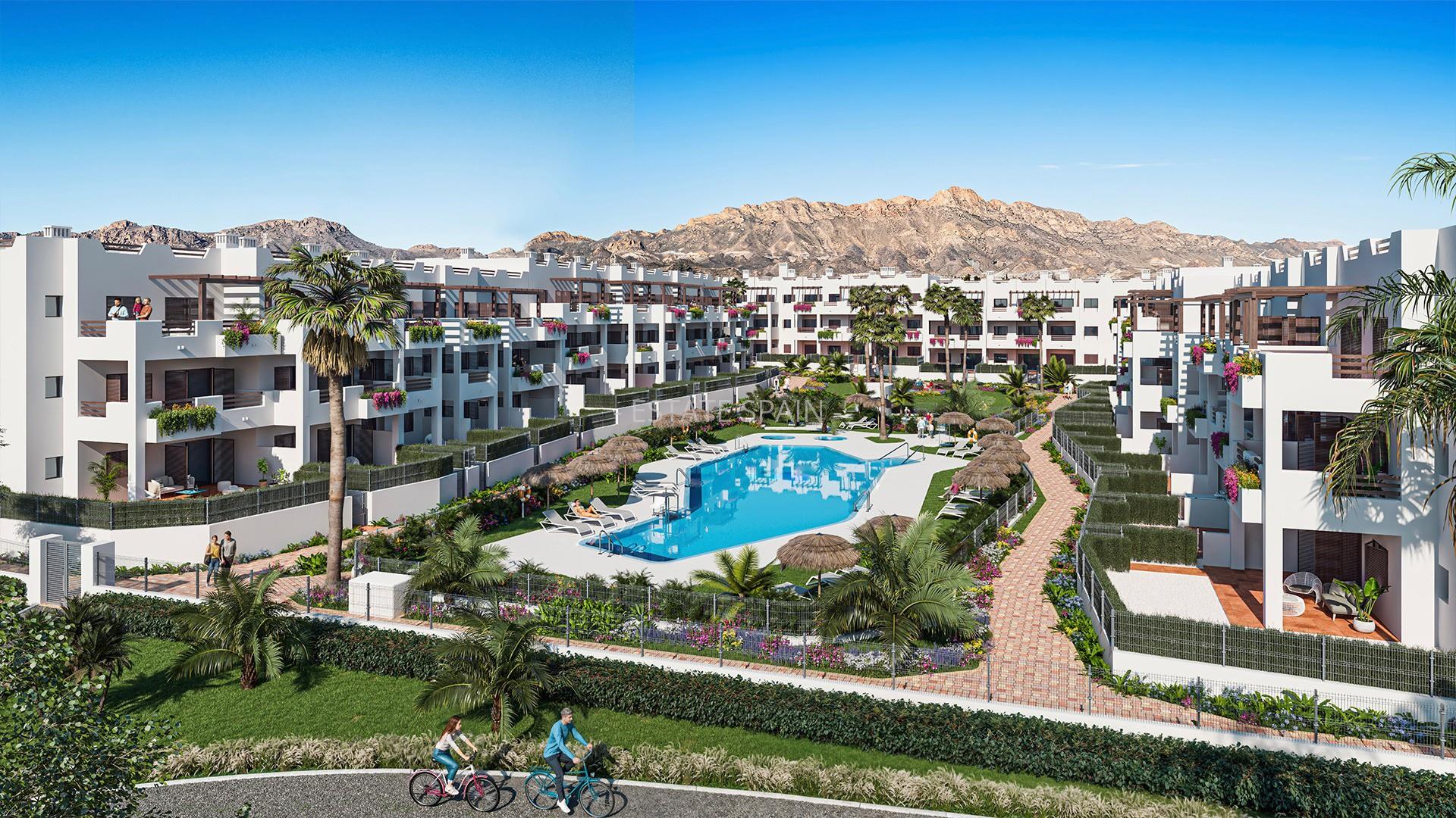 Новые, меблированные апартаменты недалеко от моря в Пульпи, Андалусия, Коста-де-Альмерия. В апартаментах площадью 67 кв.м есть cпальня, санузел, гостиная и кухня. Из окон открывается замечательный вид на море. На территории есть сад.