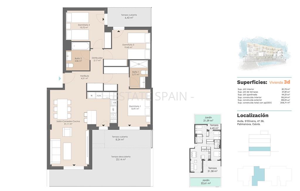 Новые, меблированные апартаменты недалеко от моря в Кальвия, Балеарские острова, Майорка. В апартаментах площадью 163 кв.м есть 3 cпальни, 2 санузла, гостиная и кухня.
