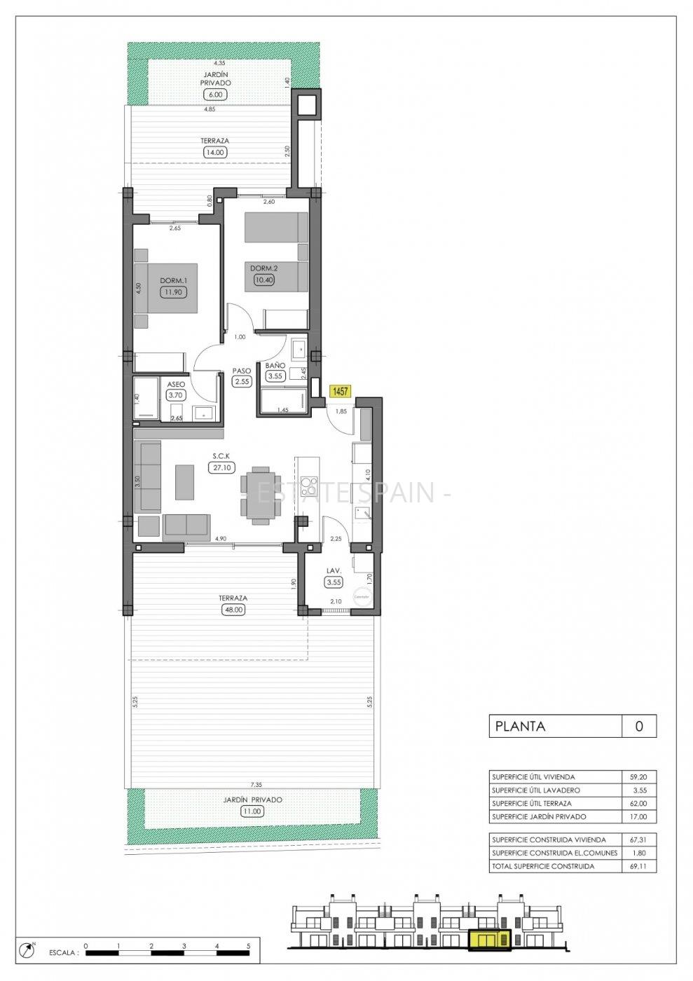 Новое, меблированное бунгало в Альгорфа, Коста Бланка. В бунгало площадью 72 кв.м есть 2 cпальни, 2 санузла, гостиная и кухня. На территории есть сад.