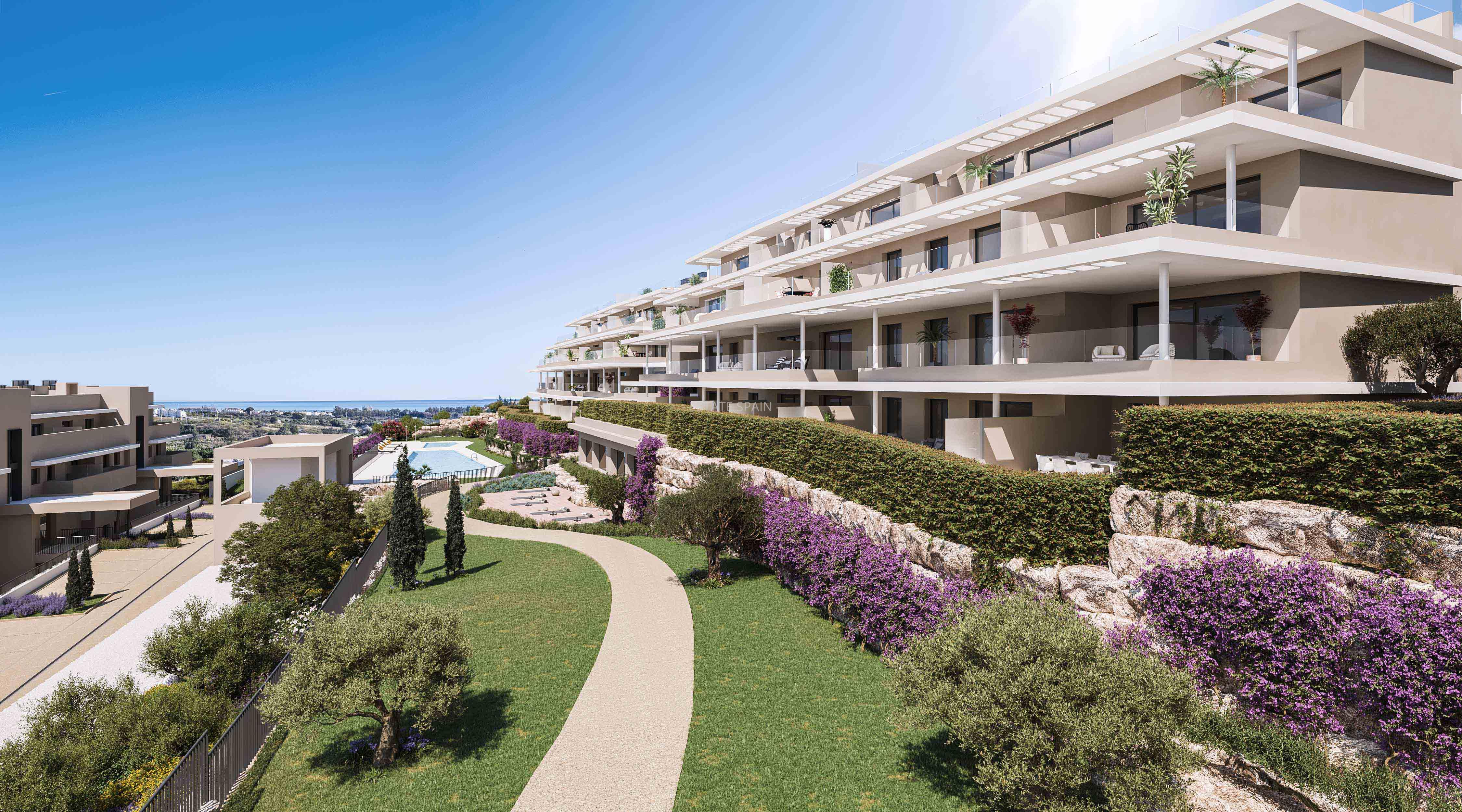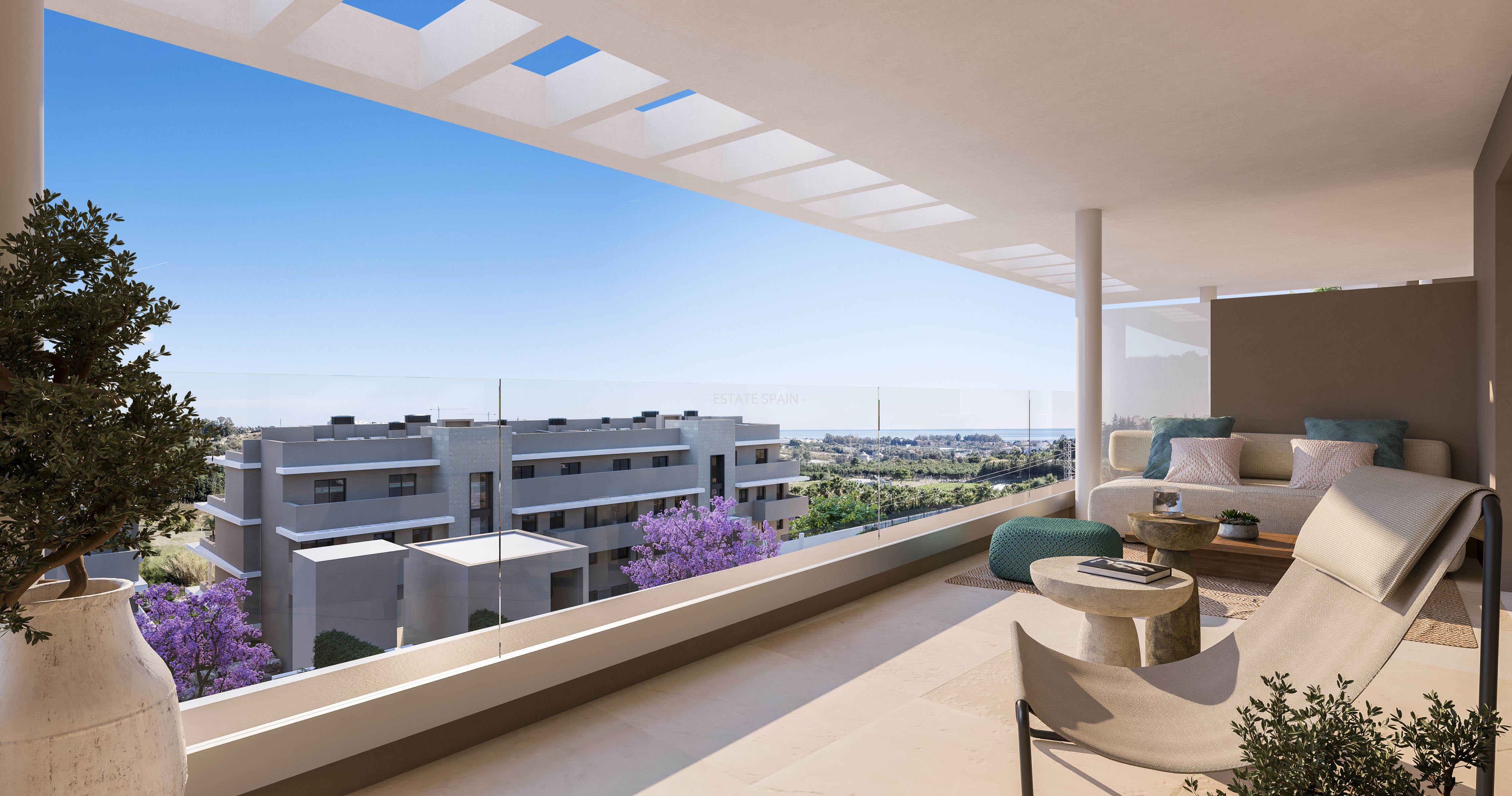 Новое, меблированное бунгало в Эстепоне, Андалусия, Коста-дель-Соль. В бунгало площадью 101 кв.м есть 2 cпальни, 2 санузла, гостиная и кухня. Из окон открывается замечательный вид на море. На территории есть сад.