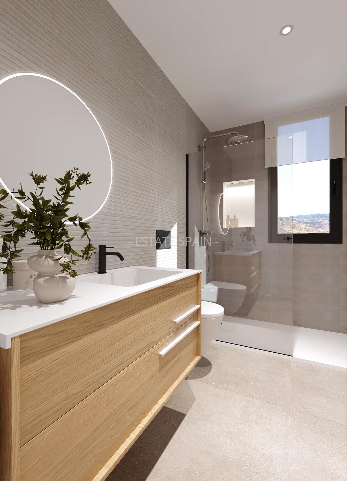 Новая, меблированная вилла в Финестрате, Коста Бланка. В вилле площадью 154 кв.м есть 3 cпальни, 3 санузла, гостиная и кухня. Из окон открывается изумительный вид на море. На территории есть сад.