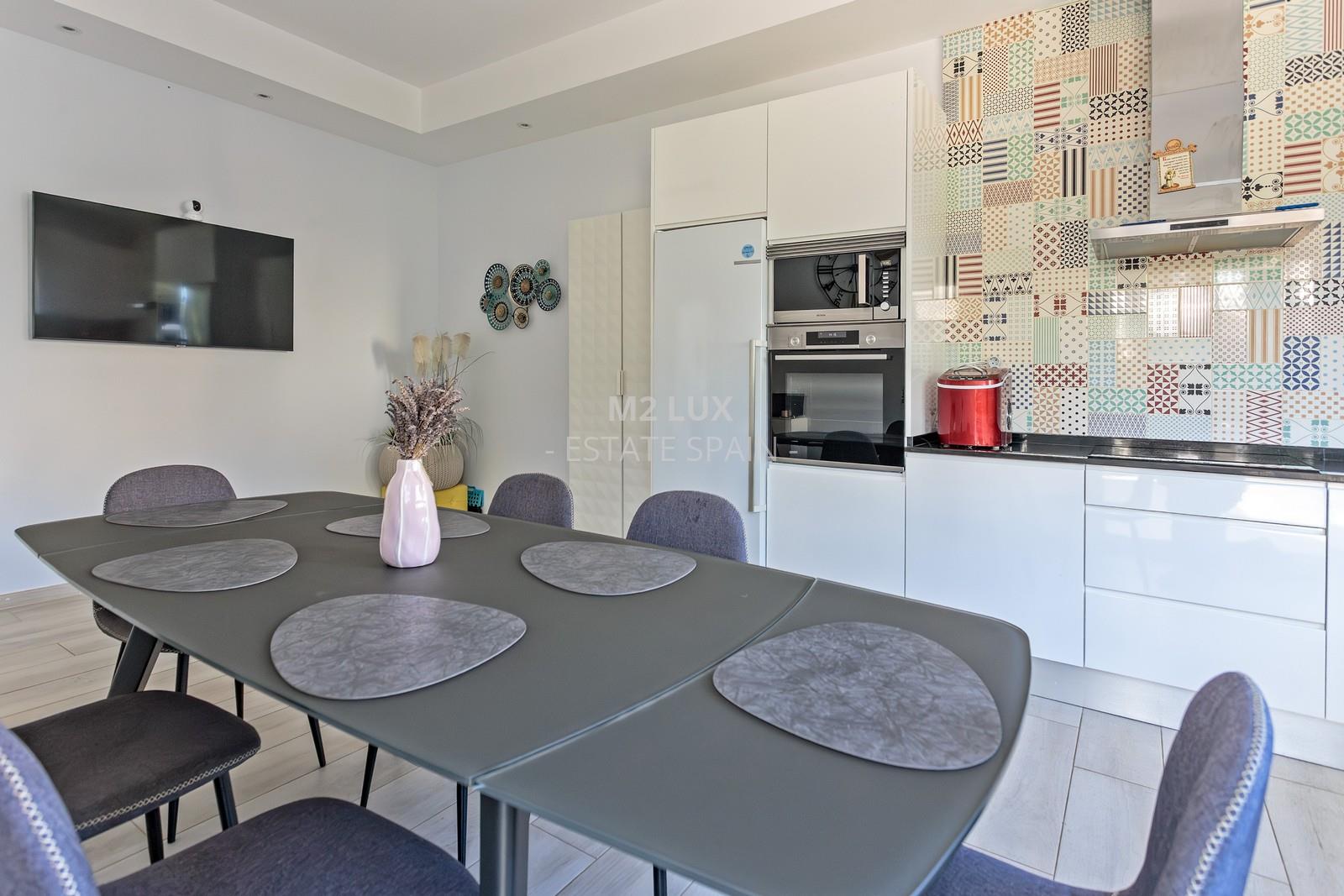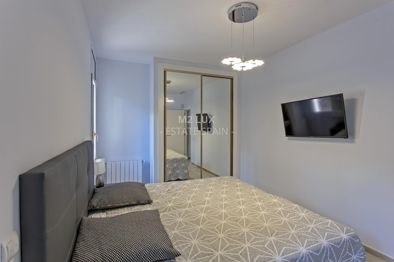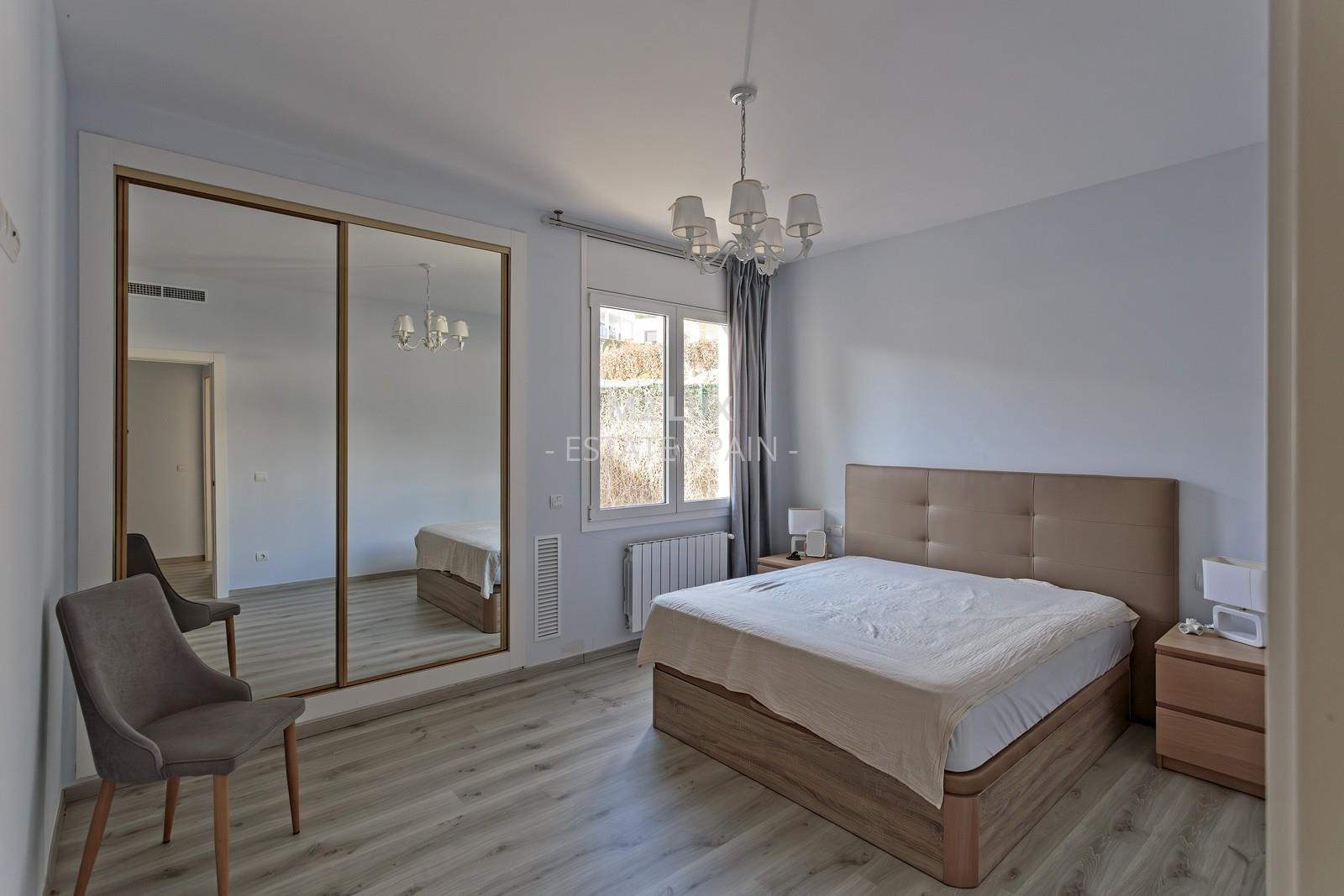 Просторная прихожая. Просторная гостиная с выходом на террасу с выдвижным навесом и к бассейну. Отдельная полностью оборудованная кухня. Гостевая спальня. Отдельный санузел с душем и прачечная. Гараж на 1 автомобиль.