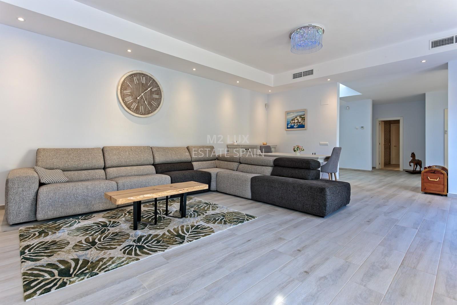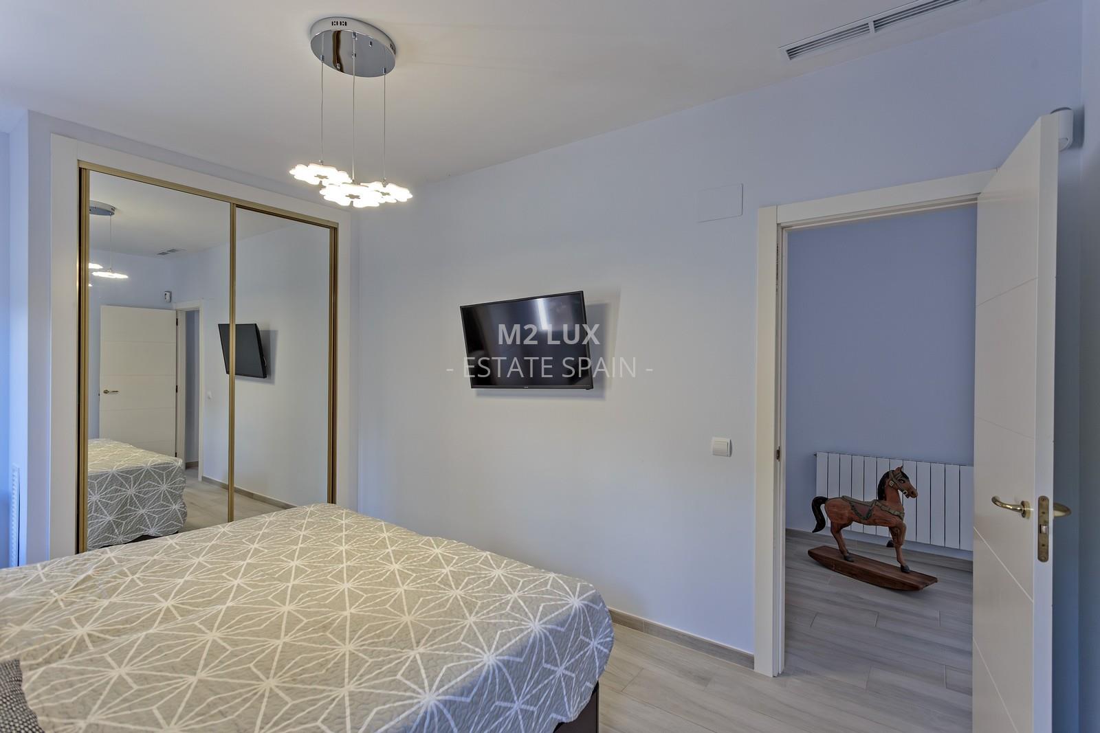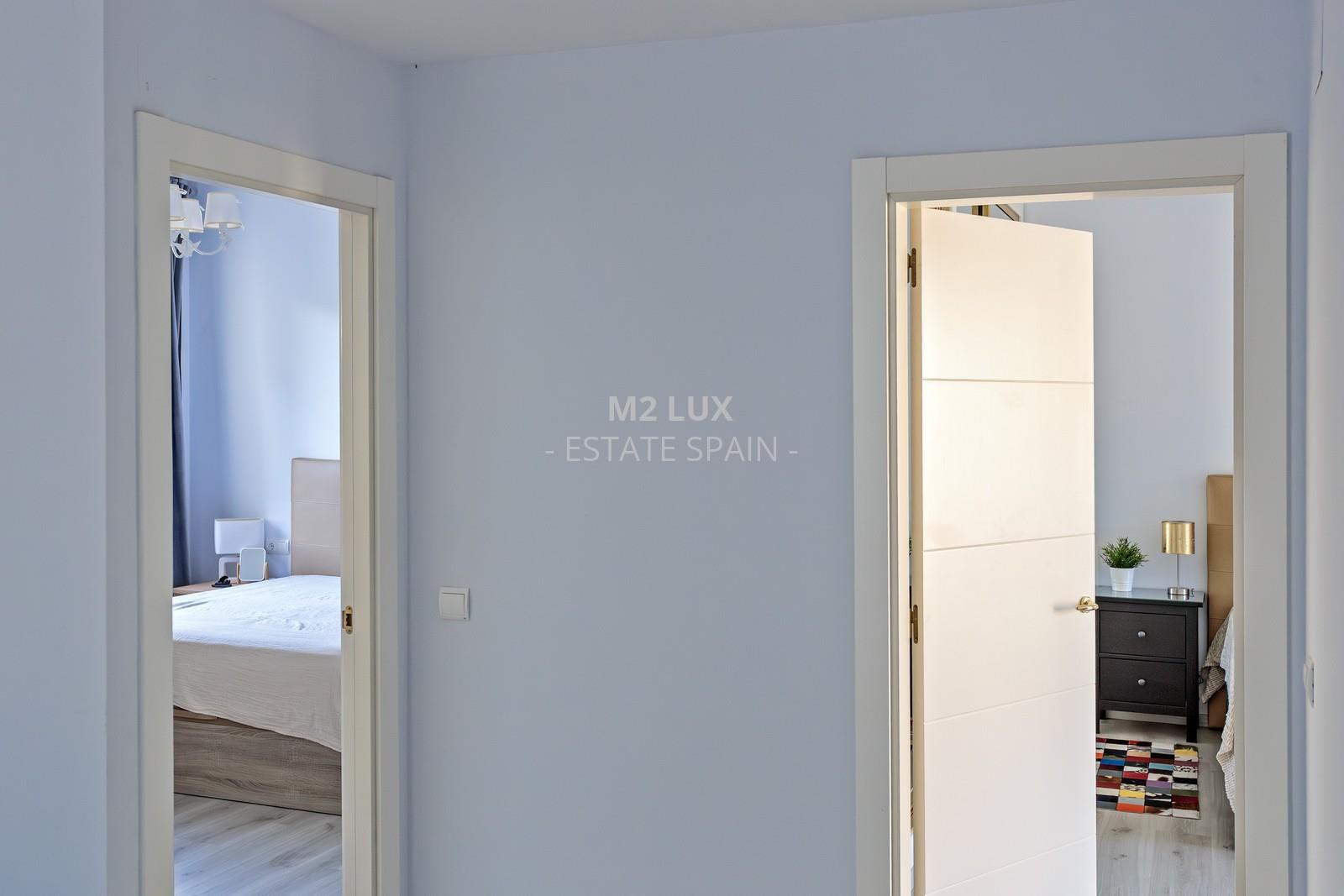 Просторная прихожая. Просторная гостиная с выходом на террасу с выдвижным навесом и к бассейну. Отдельная полностью оборудованная кухня. Гостевая спальня. Отдельный санузел с душем и прачечная. Гараж на 1 автомобиль.